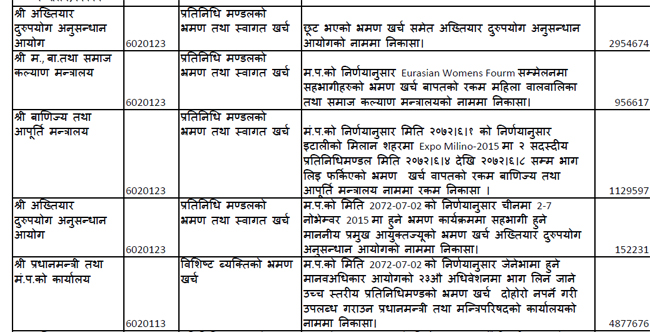 वाणिज्य तथा आपूर्ति मन्त्रालयको दुईजनाको टोली इटालीको मिलान शहरमा आयोजित एक्स्पोमा भाग लिन जाँदा भएको खर्च १ लाख २९ हजार ५ सय ९७ रुपैयाँ अर्थ मन्त्रालयले निकासा गरिसकेको अर्थ मन्त्रालयले जनाएको छ ।