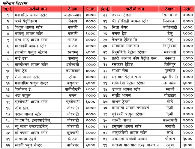 आयल निगमले भालिका लाागि तेल वितरण हुने ४४ वटा पम्पहरु तोकेको छ । बिहीबार झण्डै २ लाख लिटर भन्दा बढी पेट्रोल वितरण हुनेछ ।
